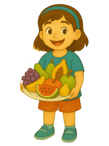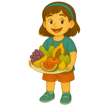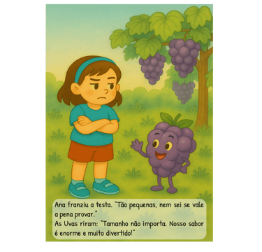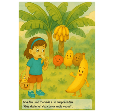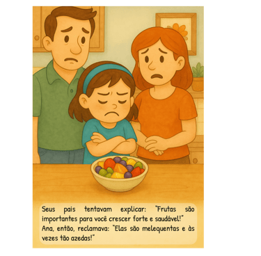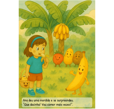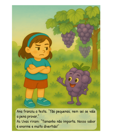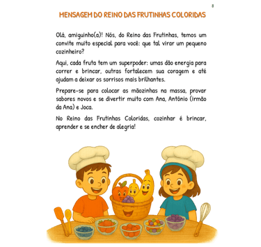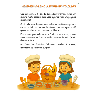 História ilustrada: Ana e Joca embarcam numa jornada encantadora pelo Reino das Frutinhas Coloridas.